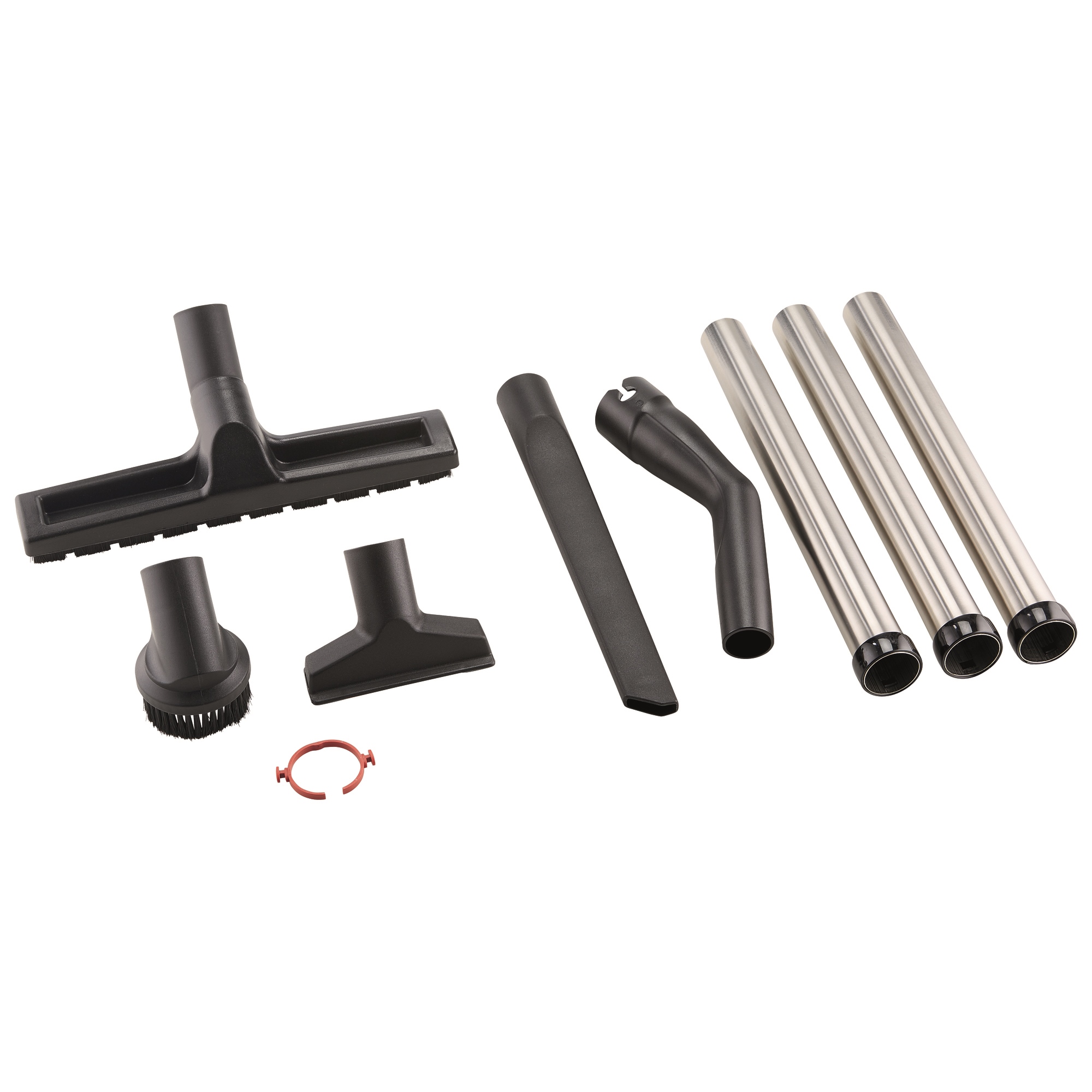 Bestehend aus Krümmer (445.010) antistatisch zur Verbindung von Saugschlauch und Saugrohr, 3 x 350 mm Verlängerungsrohr INOX (445.207), Clipbodendüse (445.509), Rundbürste (385.646), Polsterdüse (385.549) und Fugendüse (385.530).