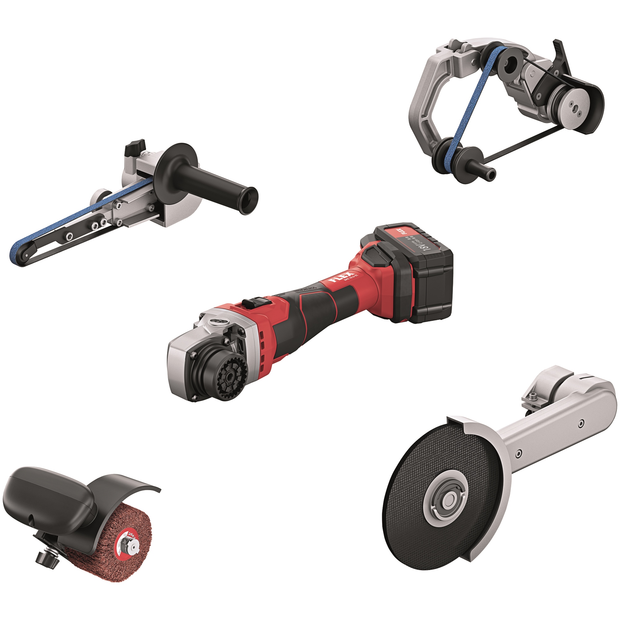 Einzigartiger Werkzeugvorsatz mit Schnellkupplung zum werkzeuglosen Wechsel der vier System-Vorsätze zum Satinieren und Rohrbandschleifen, zum Schleifen mit Bandfeile oder Kehlnahtschleifer