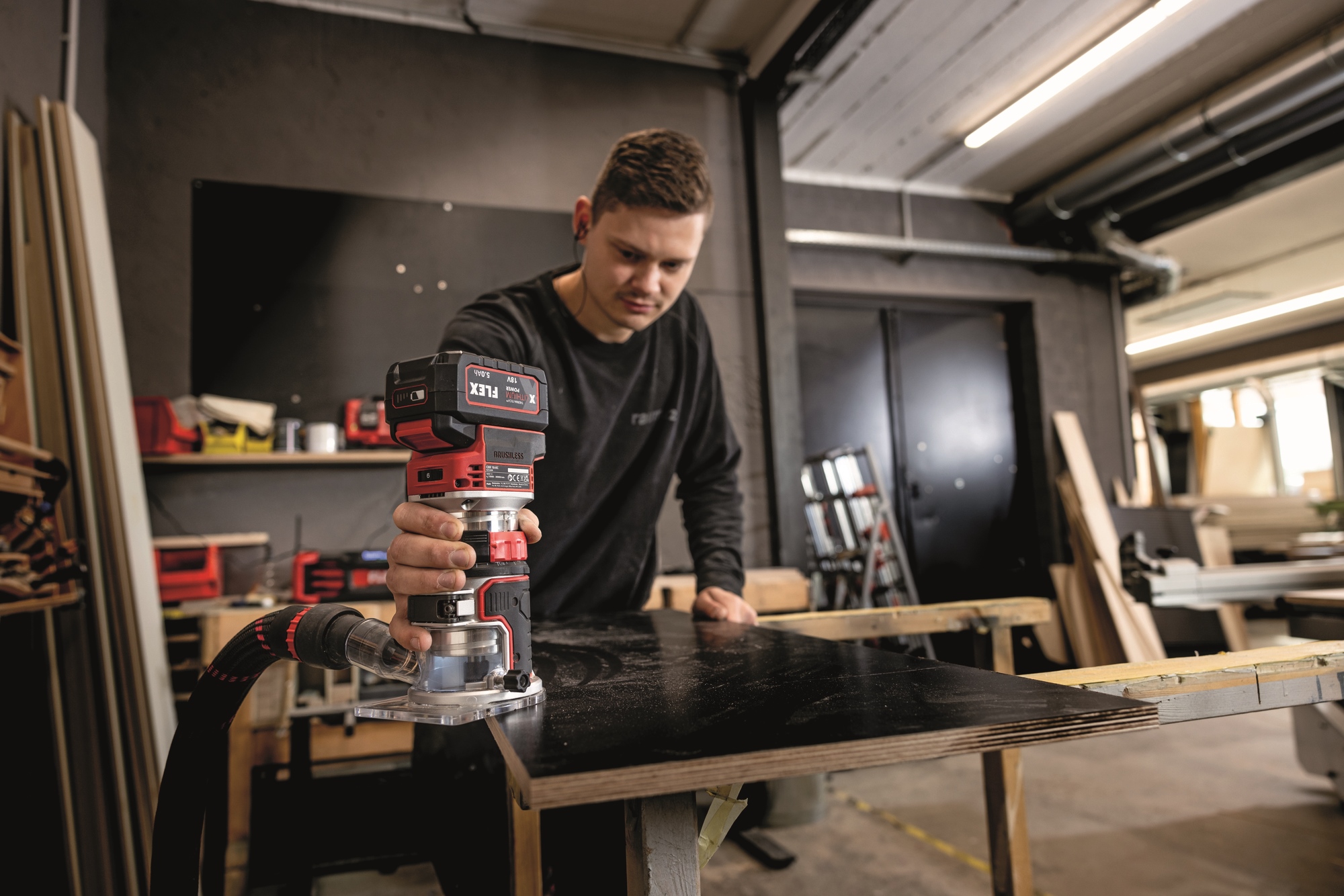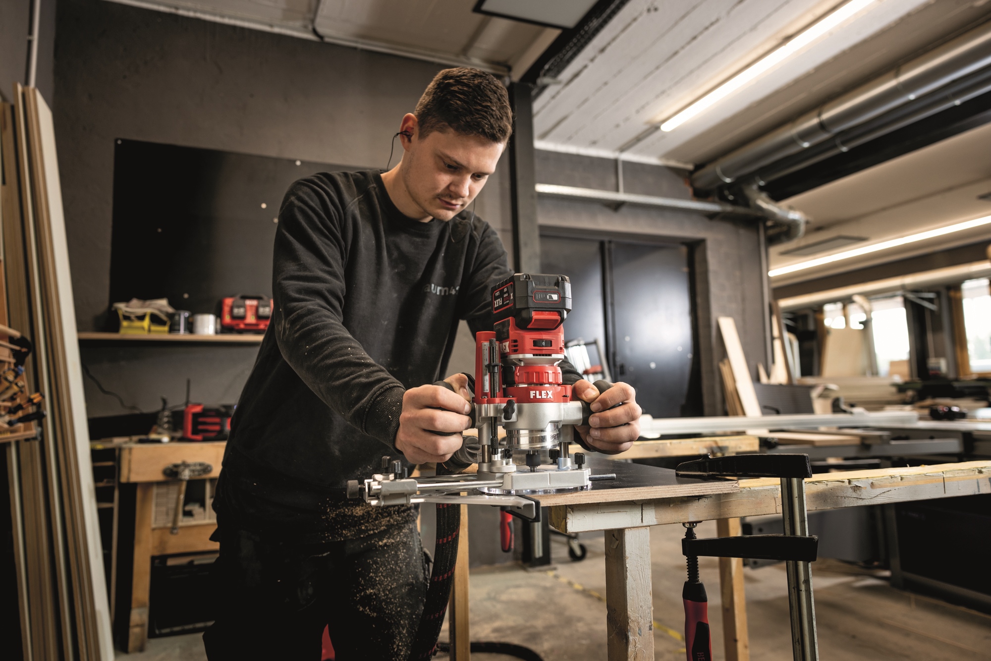 Kanten- und Oberfräse in Einem. Werkzeugloser Umbau von der Kanten- zur Oberfräse