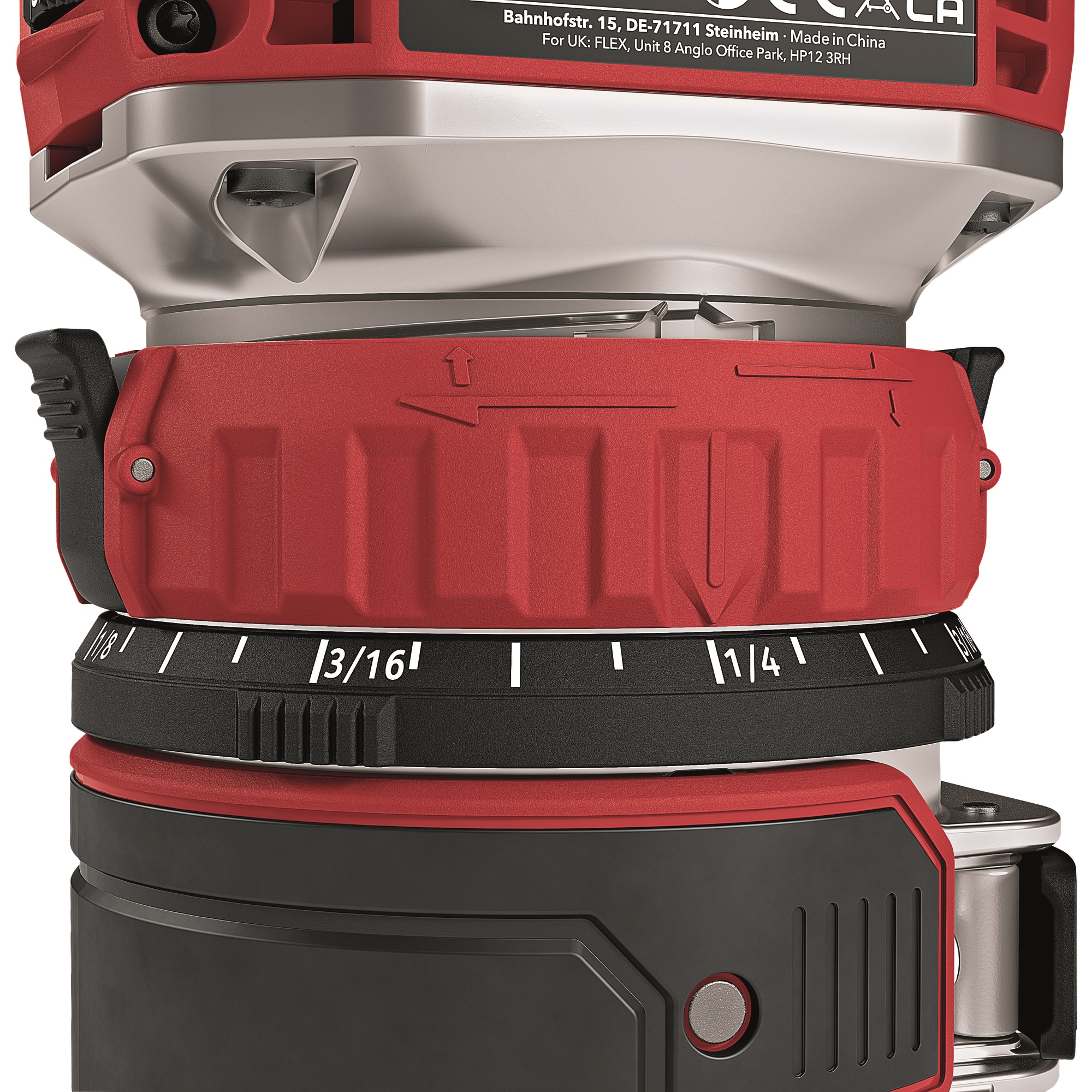 Mit Nullfunktion der Skala, Frästiefeneinstellung über Revolveranschlag sowie stufenlose Frästiefen-Feineinstellung über Drehring