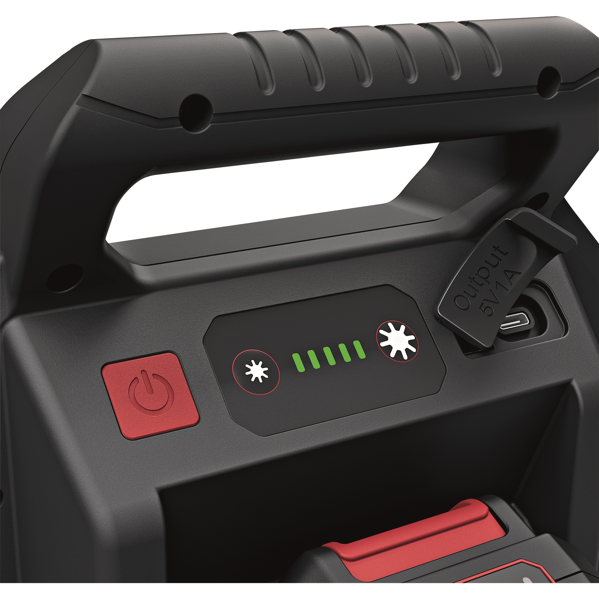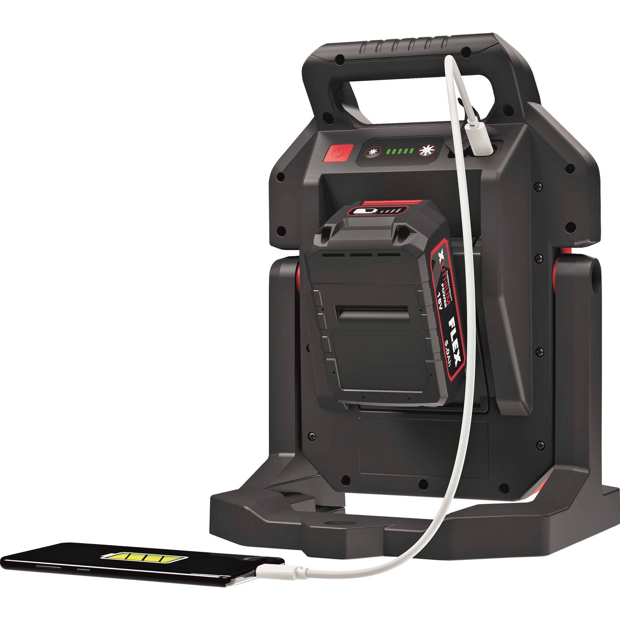 Leistungsstarker 5000 Lumen Akku-Baustrahler mit 5 Helligkeitsstufen plus ECO Modus. Mit Memory Funktion, das Licht startet mit der zuletzt eingestellten Stufe