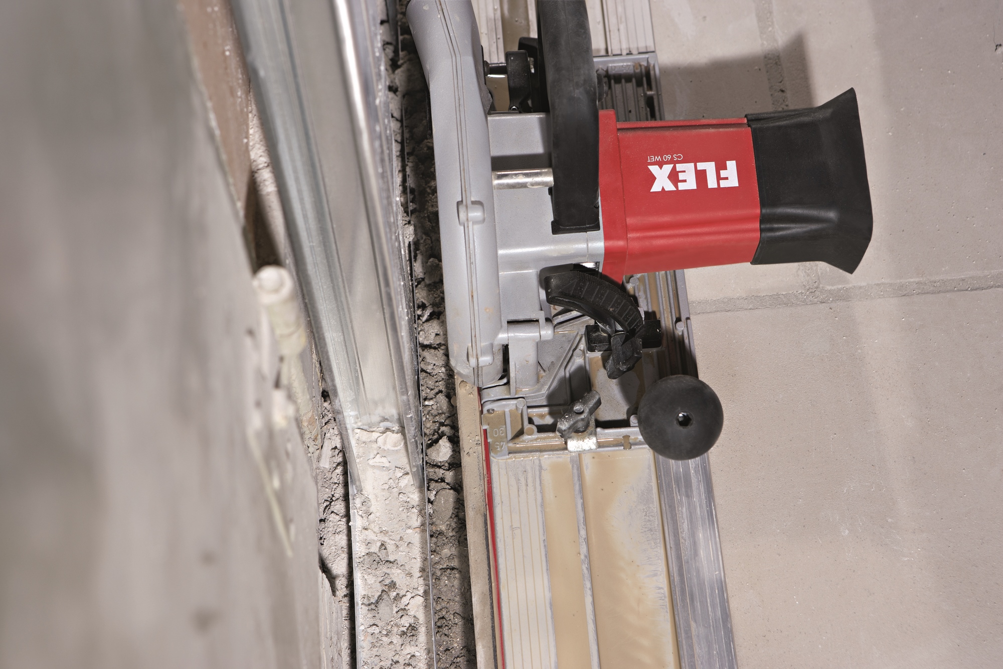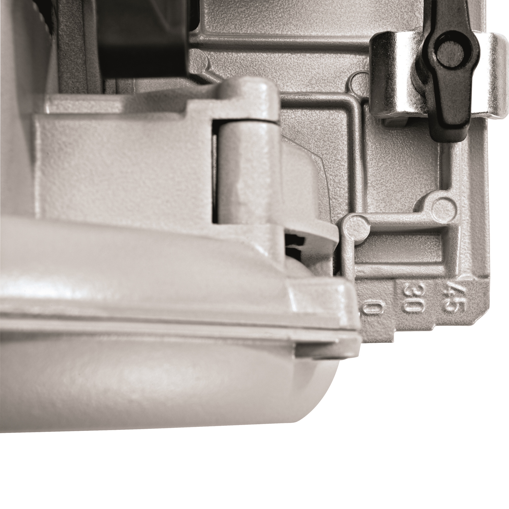 Stufenlose Schnitttiefeneinstellung von 0-60 mm, mit Führungsschiene bis 54 mm. Im Gehrungsschnitt von 0-44 mm, mit Führungsschiene bis 38 mm