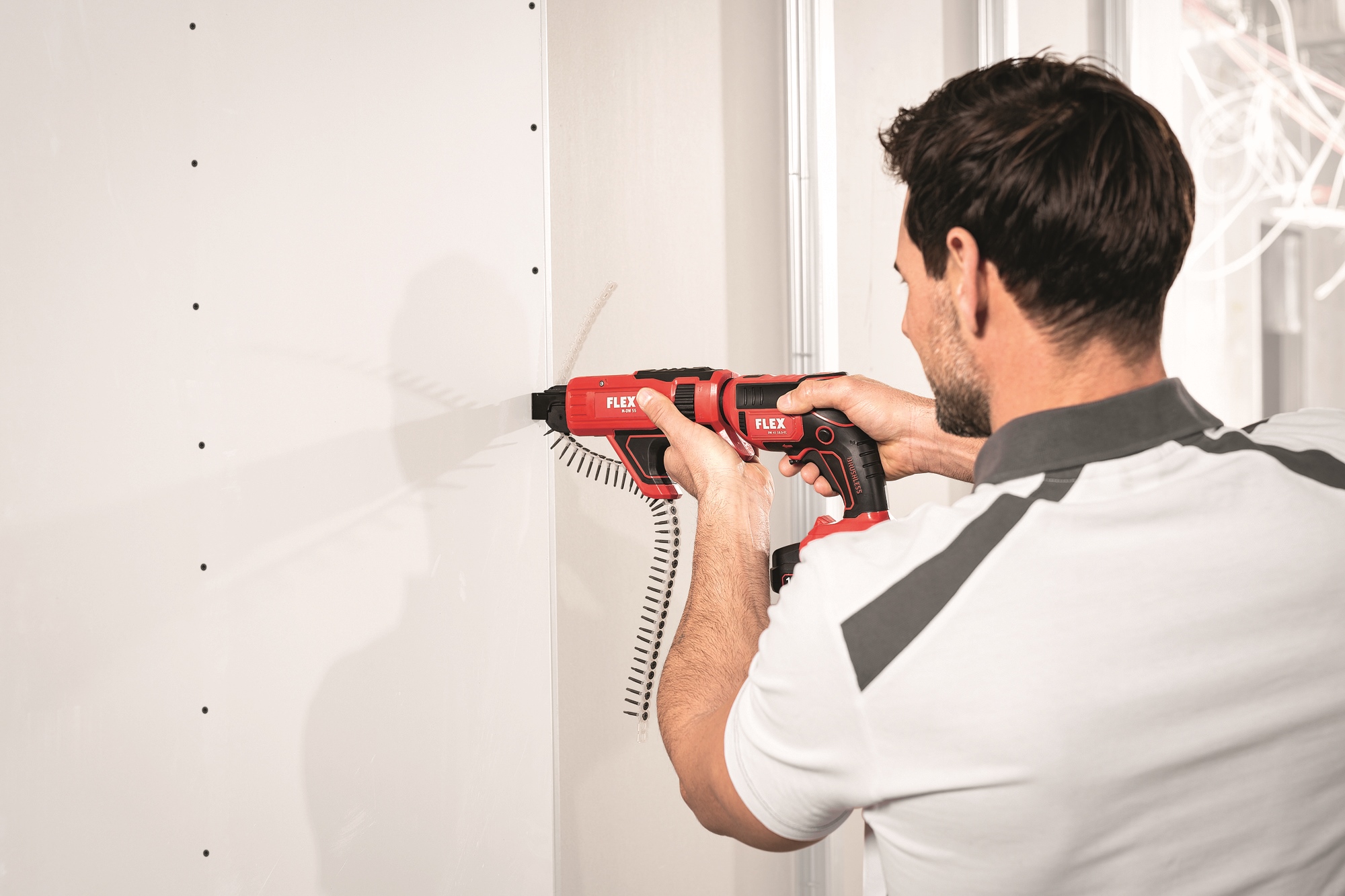 Ergonomische Zweihandbedienung von Magazin und Trockenbauschrauber für zuverlässige und genaue Verschraubungen