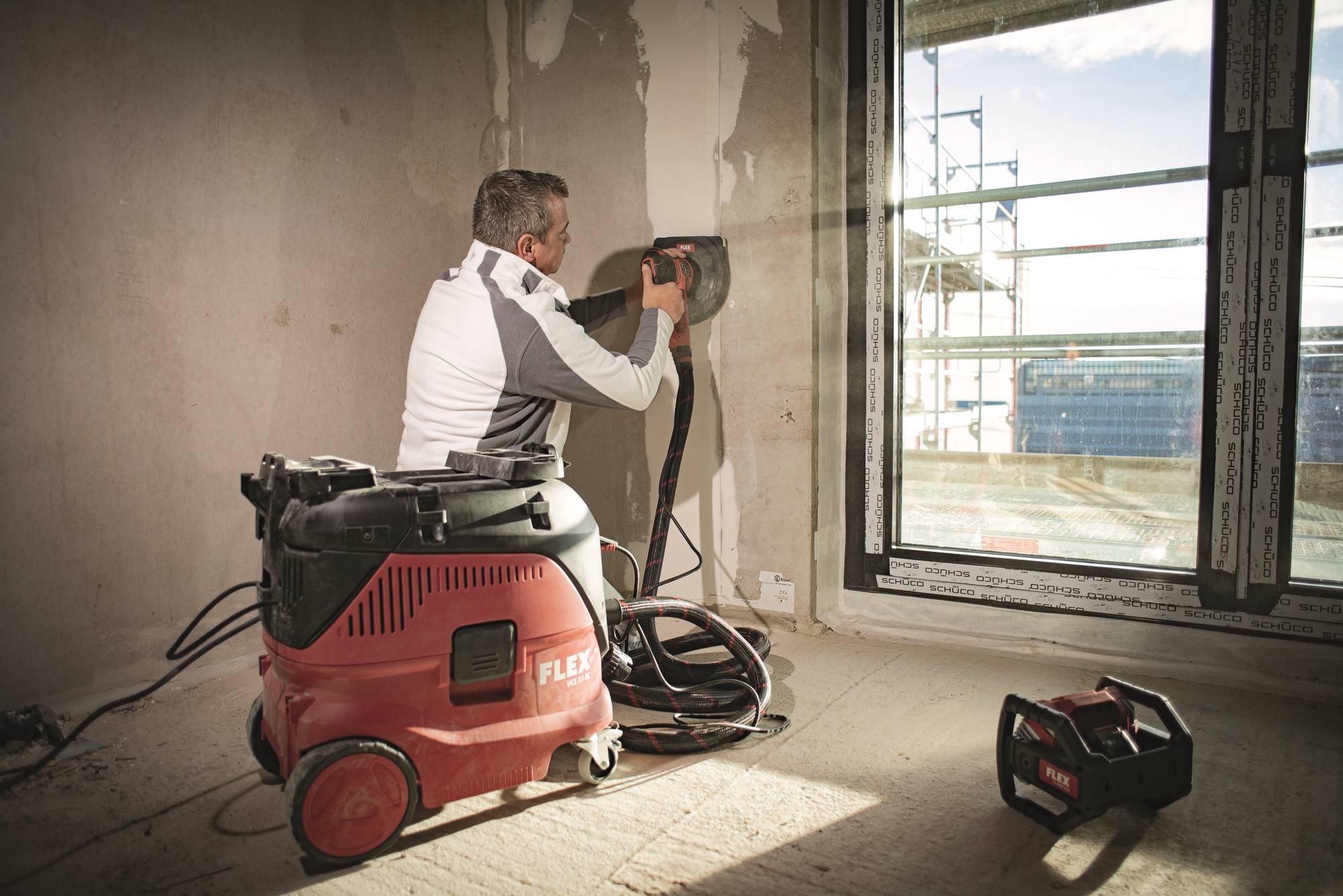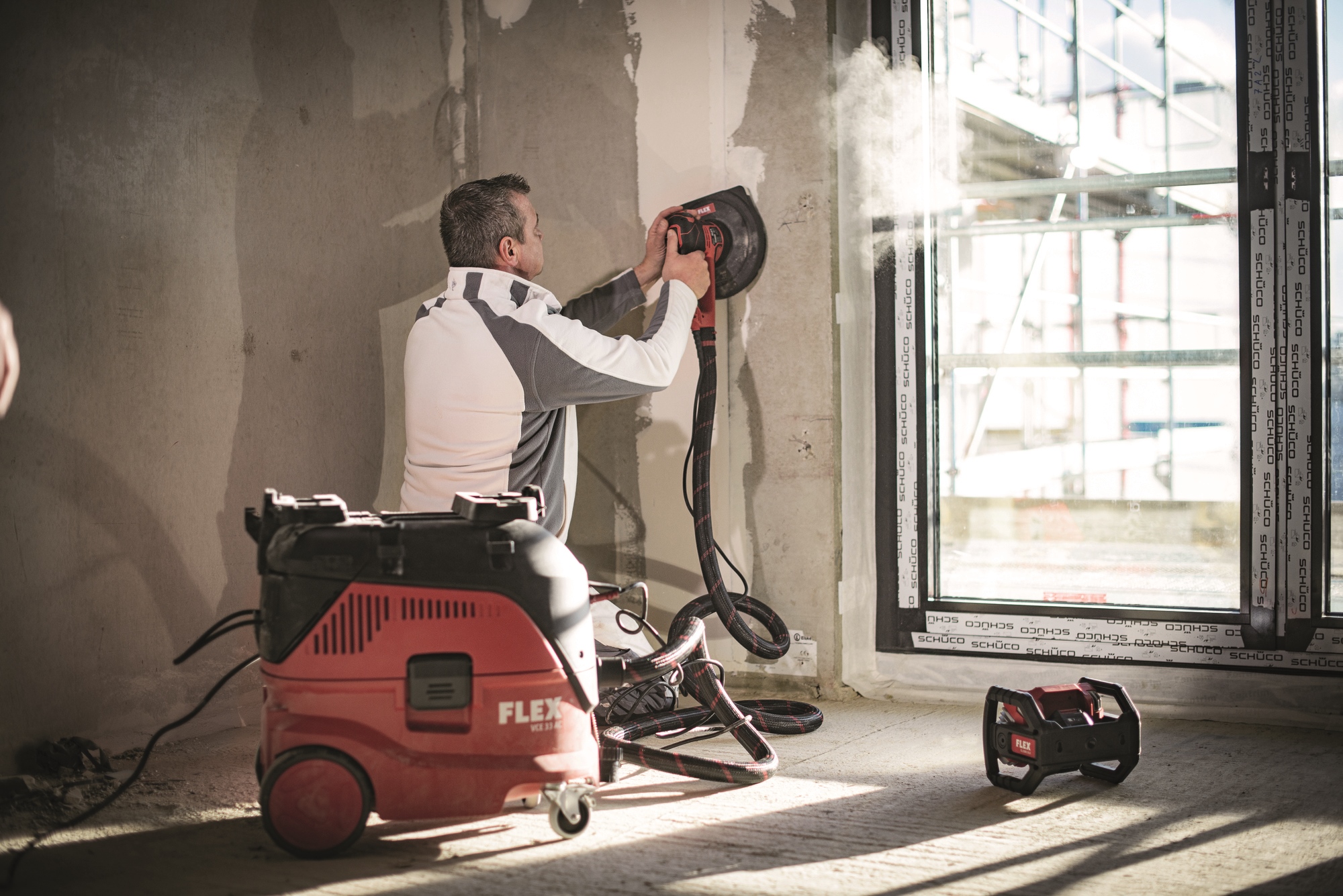 Definierte Schlauchführung und wirkungsvolle Staubabsaugung durch großen Absaugquerschnitt. Der Saugschlauch wird direkt mit dem FLEX Clip-System an die Maschine angeschlossen