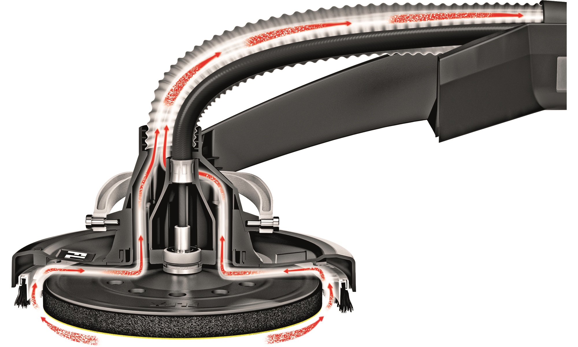 Die effektive Absaugung zwischen Bürstenkranz und Schleifteller verhindert ein Zusetzen des Schleifmittels und sorgt für staubfreies Arbeiten