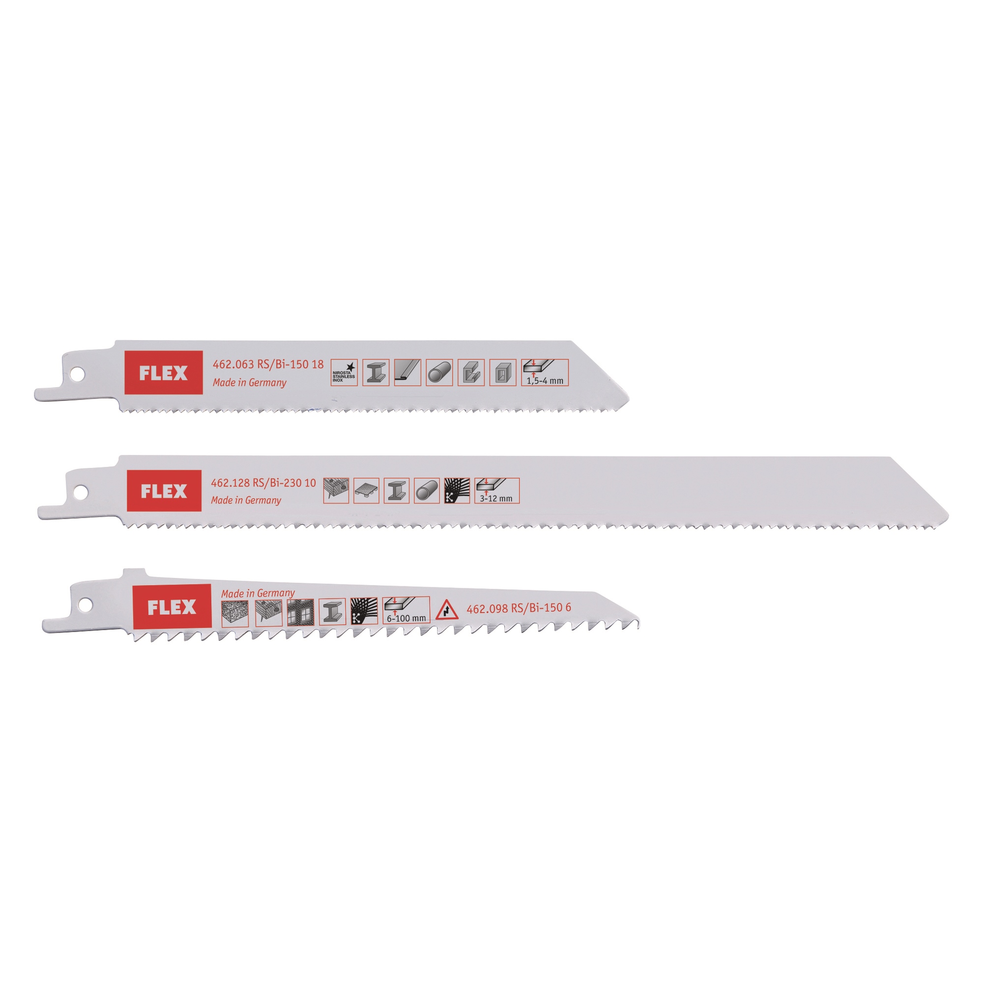 Sortiment bestehend aus: 1 Säbelsägeblatt für Schnitte von 1,5-3 mm in rostfreien Stahl, Metall/Stahl, Stahlbleche, Stahlrohre, offene/geschlossene Profile. 1 Säbelsägeblatt für Schnitte von 6-100 mm in MDF, Holz mit Nägeln, für Altbausanierung/Fensterrahmen, Metall/Stahl, faserverstärkte Kunststoffe/Epoxy, Kurvenschnitte. 1 Säbelsägeblatt für Schnitte von 3-190 mm in Holz mit Nägeln, Palettenbau, faserverstärkte Kunststoffe/Epoxy, sowie für Schnitte von 3-12 mm in Metall/Stahl, Stahlrohre.