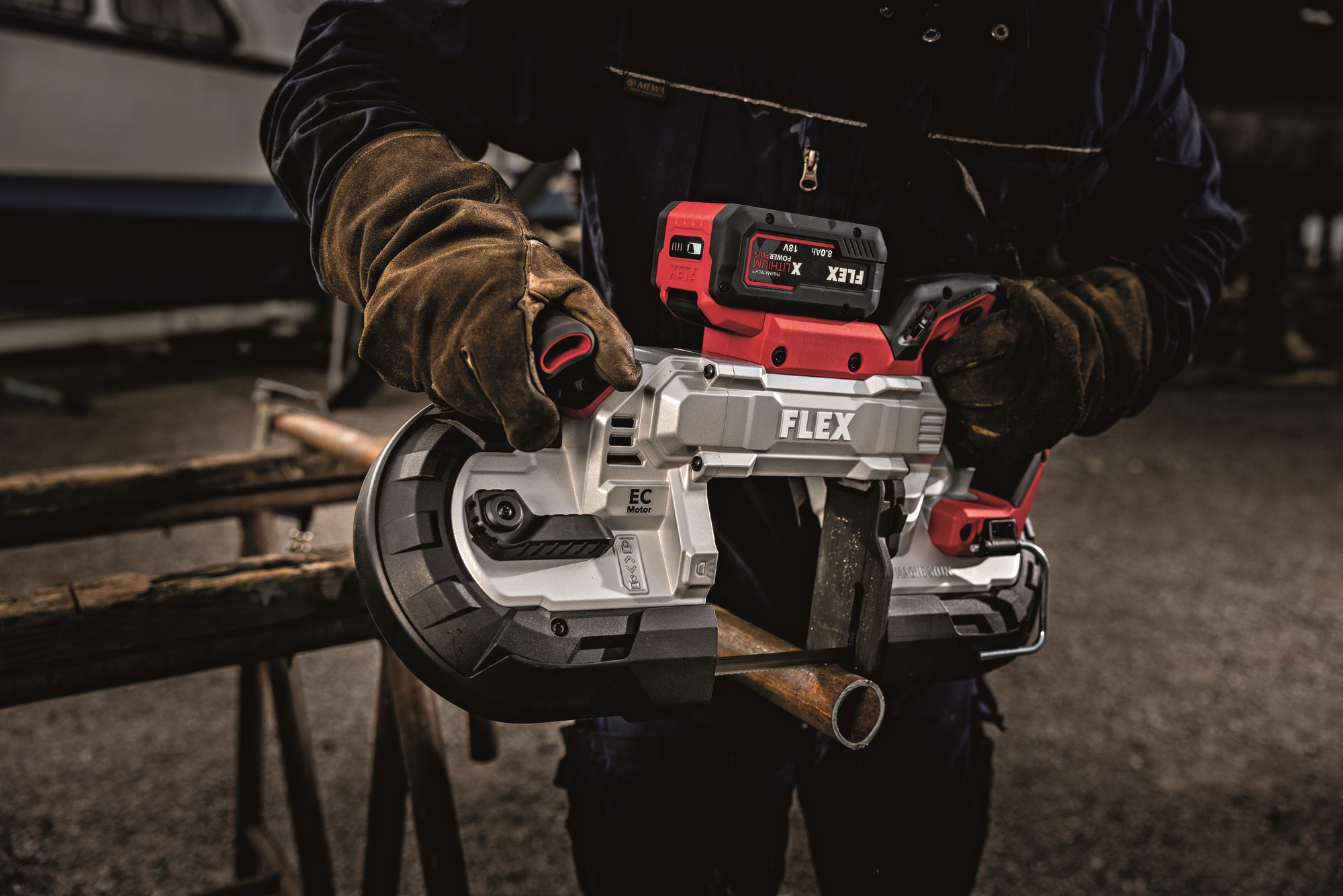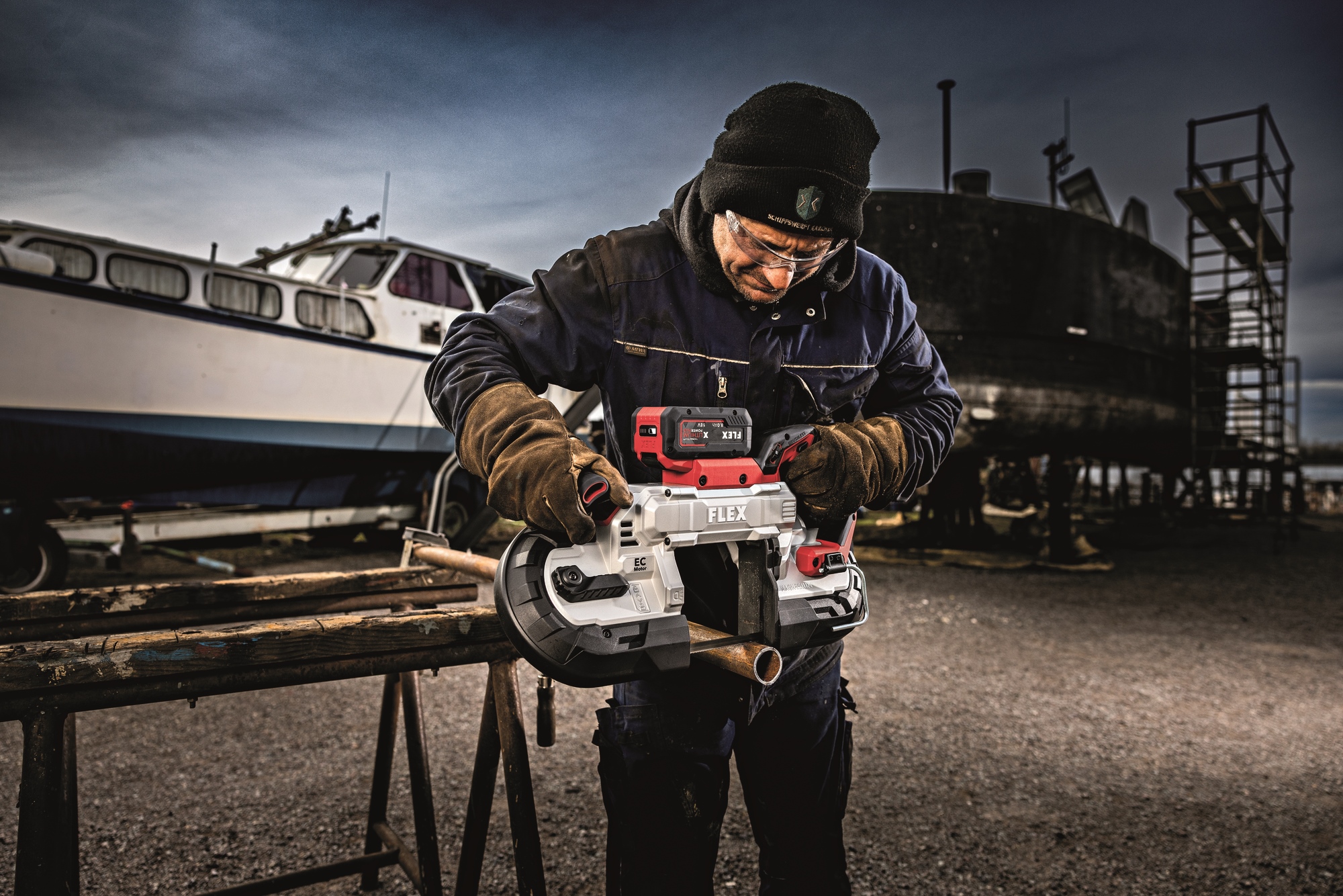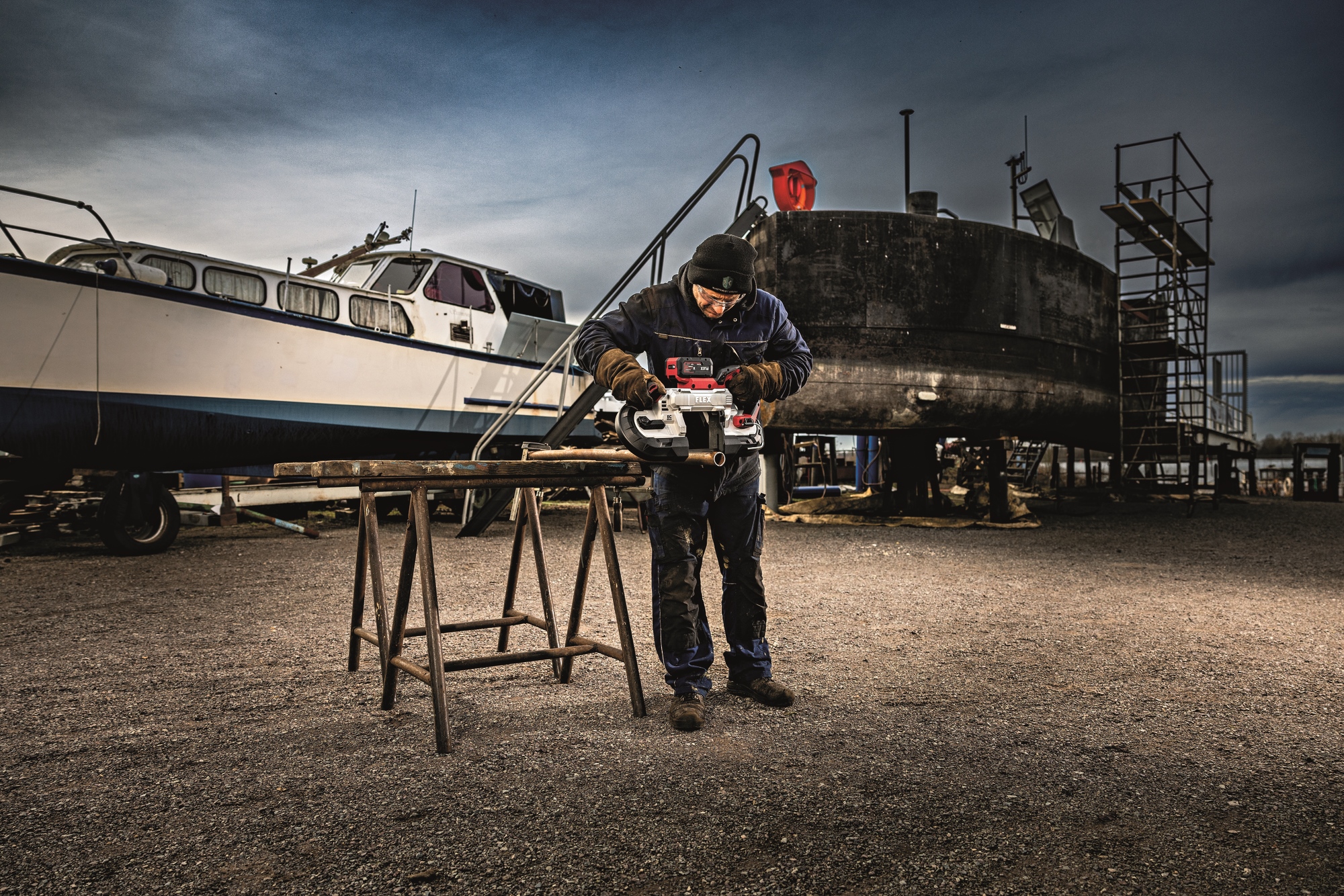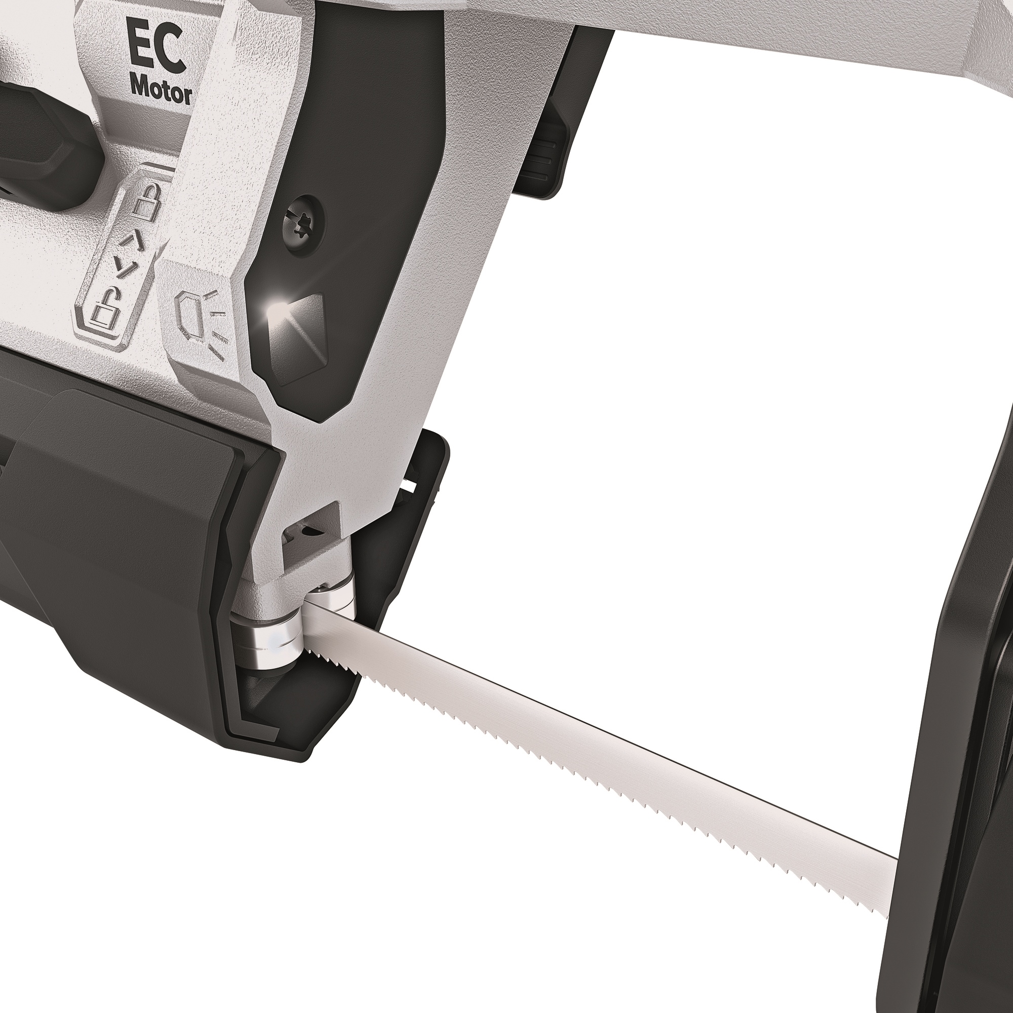 Durch die Bauweise perfekt ausbalancierte Bandsäge, unterstützt durch die optimale Gewichtsverteilung von Akku und Motor. Leichtetes Gerät der 18 Volt Klasse