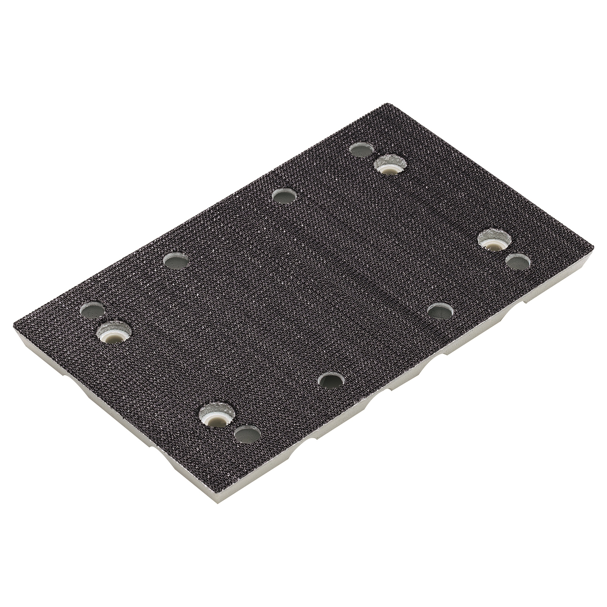Schleifplatte aus hoch strapazierfähigem Spezialmaterial mit Absauglochung (8x). Mittelabstand Lochreihen 54 mm. Absauglochung FLEX und Festool.