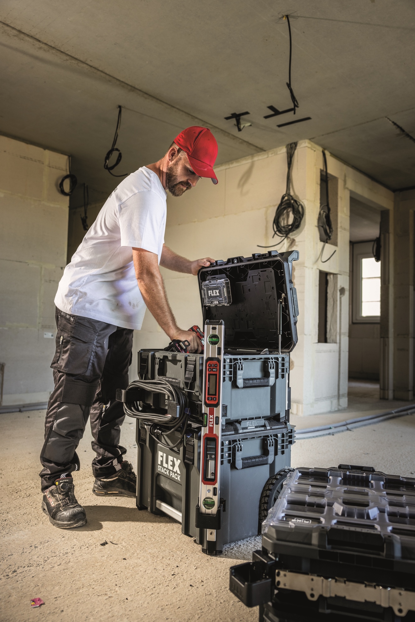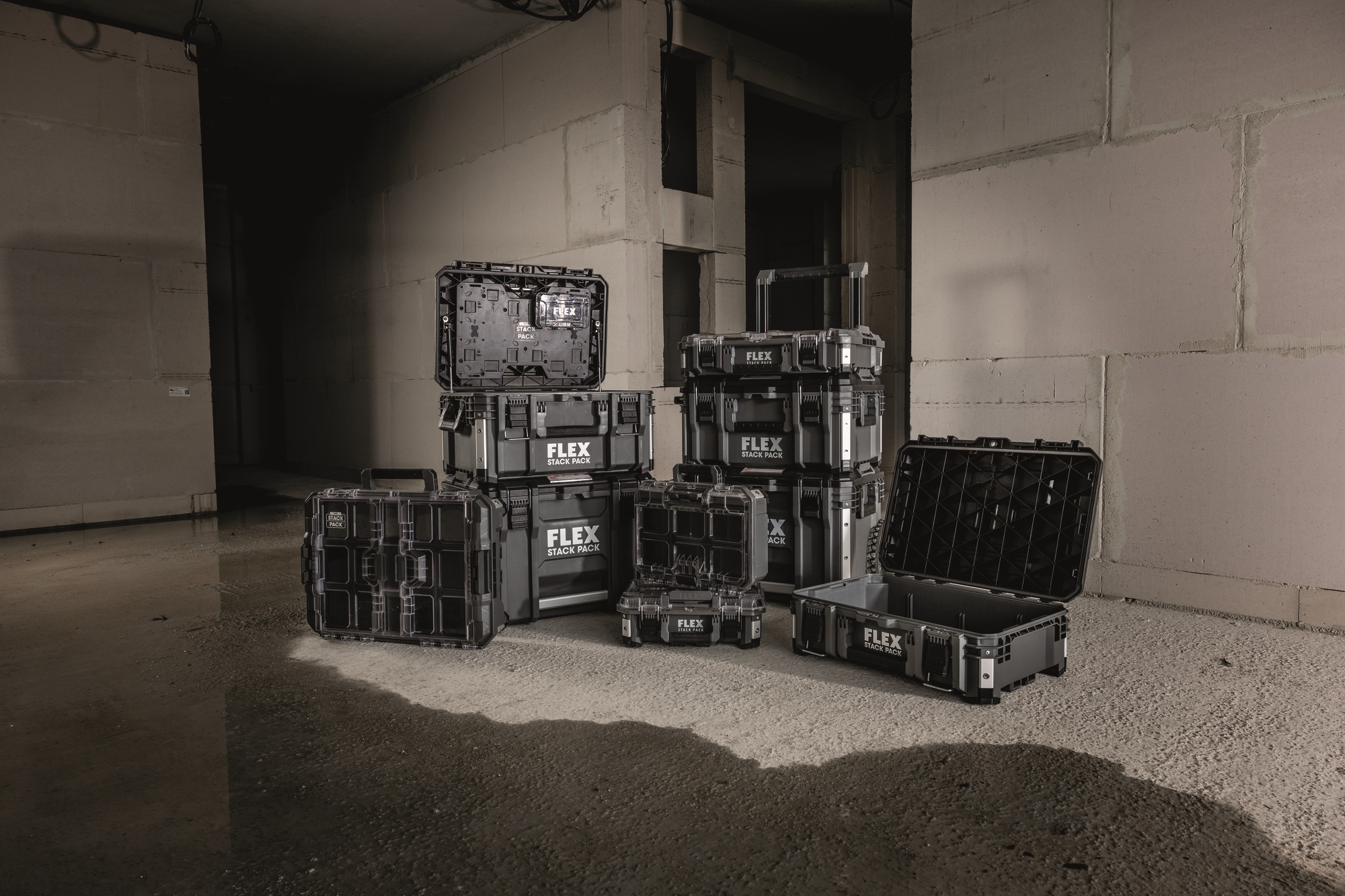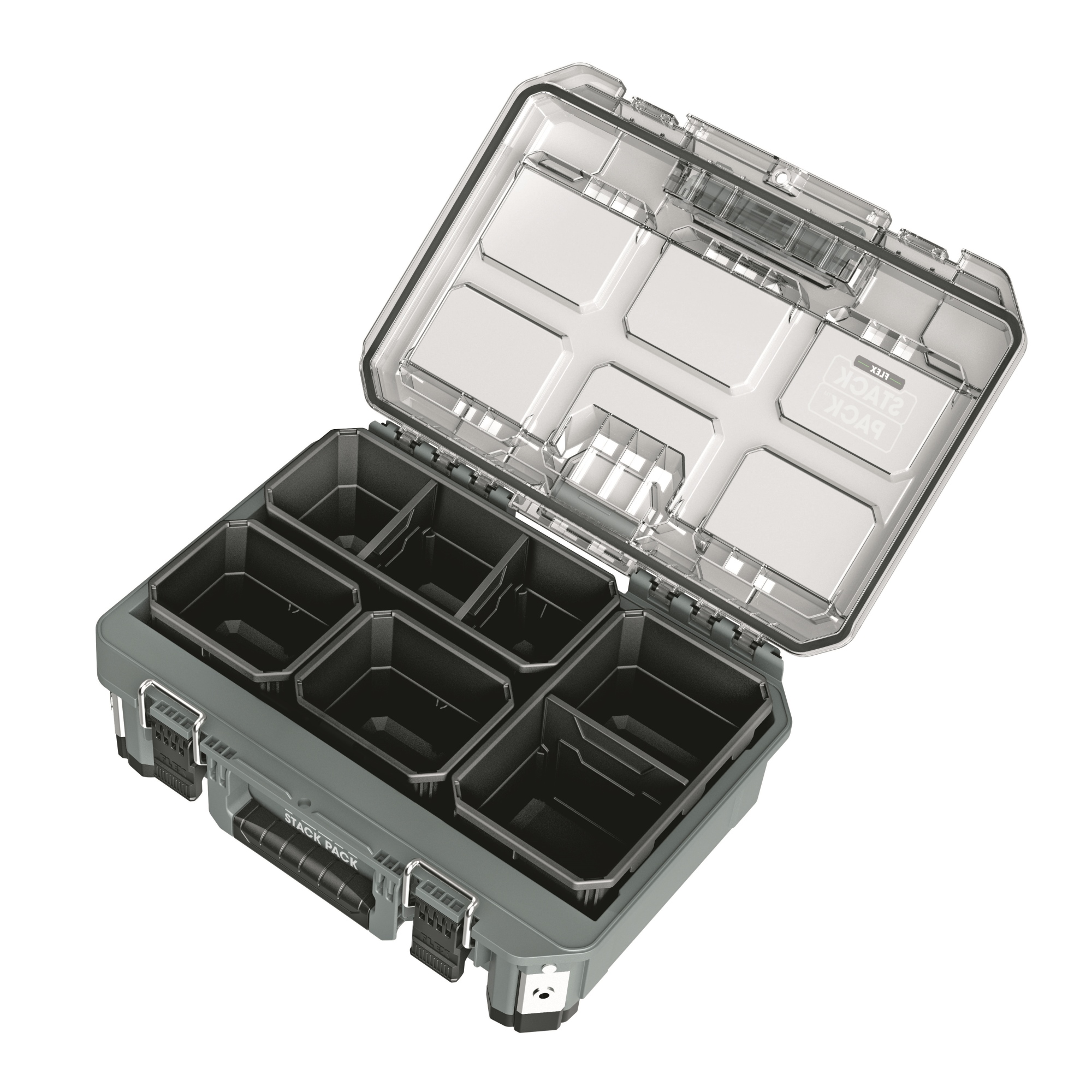 Mit dem robusten Aufbewahrungs- und Transportsystem STACK PACK lassen sich Werkzeuge und Zubehör problemlos zur Baustelle transportieren. Die Boxen aus schlagfestem Kunststoff mit Aluminium verstärkten Ecken schützen Werkzeuge und Zubehöre vor den härtesten Baustellenbedingungen. Die Boxen sind mit einem langlebigen Metallriegelverschluss ausgestattet, zusätzliche Griffe sorgen für ein flexibles und komfortables Handling. Ineinandergreifende Schnellverbindungsverschlüsse bieten schnelle, flexible und mühelose Verbindung der einzelnen Boxen, so dass das Aufbewahrungssystem nach individuellen Bedürfnissen zusammengestellt werden kann. Im Small Organizer mit durchsichtigem Deckel sind Kleinteile wie Bit Boxen, Schrauben usw. übersichtlich aufbewahrt. Inkl. vier Zubehörbehälter mit Trennwänden.