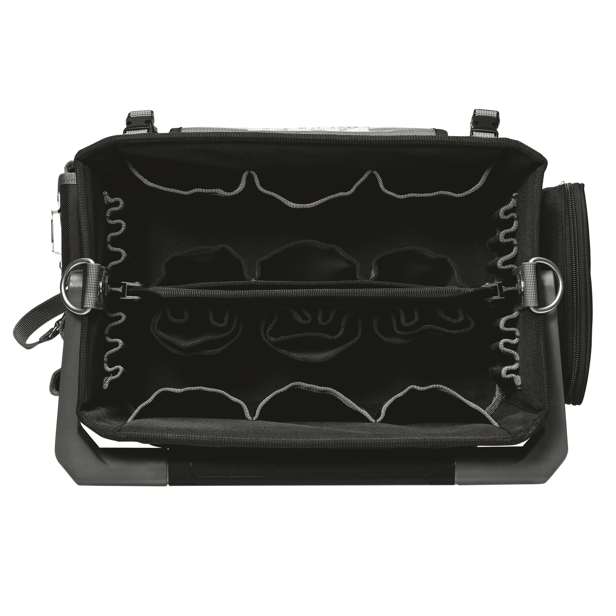 In den 44 Fächern und Innentaschen der Werkzeugtasche werden Werkzeuge und Zubehöre übersichtlich aufbewahrt. Individuelle Möglichkeiten durch innen und außen angebrachte Fächer, sowie einen herausnehmbaren Trenner mit vielen Fächern in der Taschenmitte. Die robuste Tasche besteht aus hochwertigem, doppellagigem Polyester Material. Für den bequemen Transport ist die Tasche mit einem Tragegurt mit Schulterpad sowie einem schwenkbaren Tragegriff ausgestattet. Die Werkzeugtasche lässt sich mit dem Schnellverbindungsverschluss auf dem Deckel der Boxen befestigen.