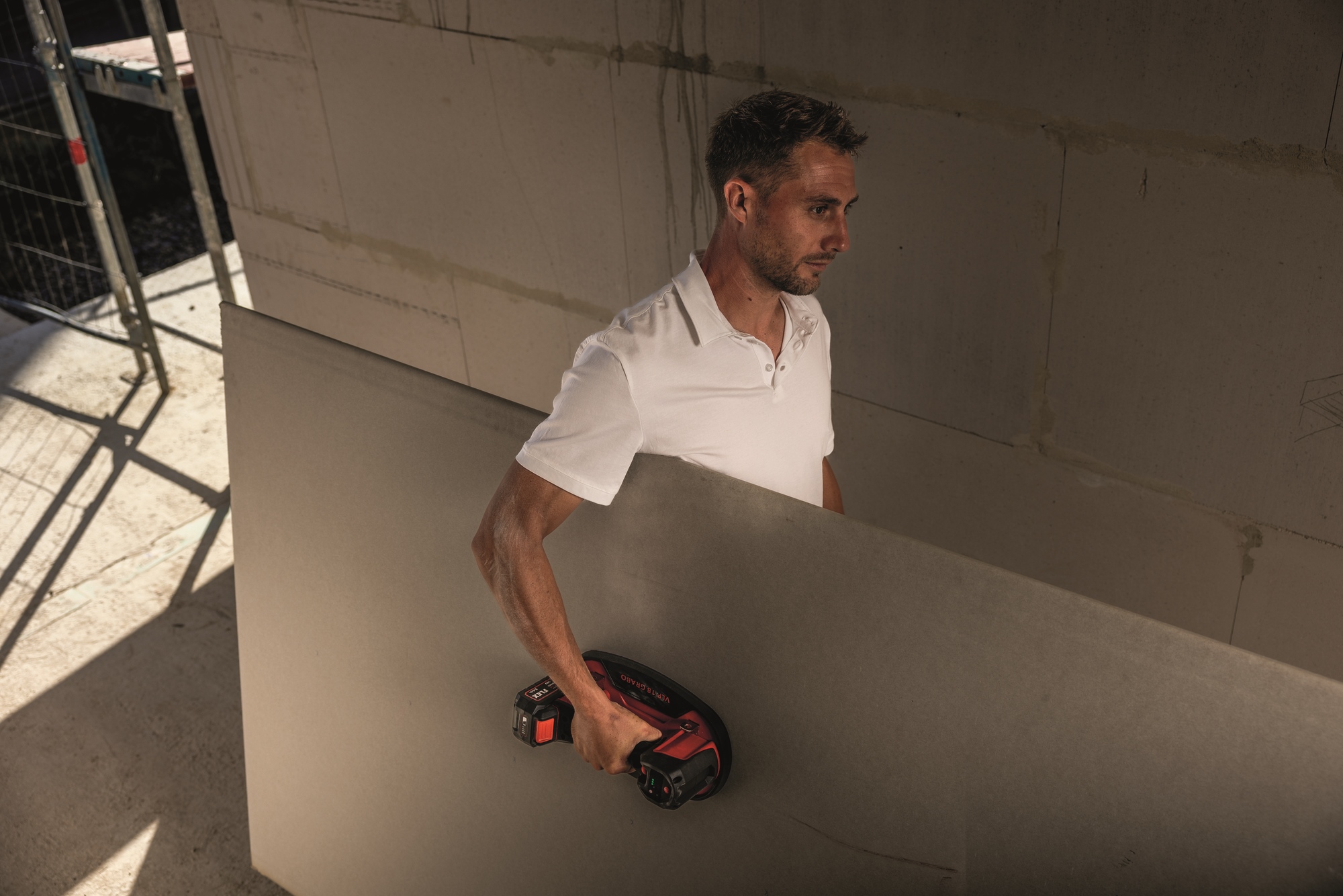 Der Vakuumheber verfügt über eine von den Umgebungsbedingungen abhängige Haltekraft von bis zu 170 kg und saugt sich auf fast jeder Oberfläche an, sogar an staubigen, rauen oder halbporösen Materialien. Die zulässige Tragfähigkeit beträgt 130 kg