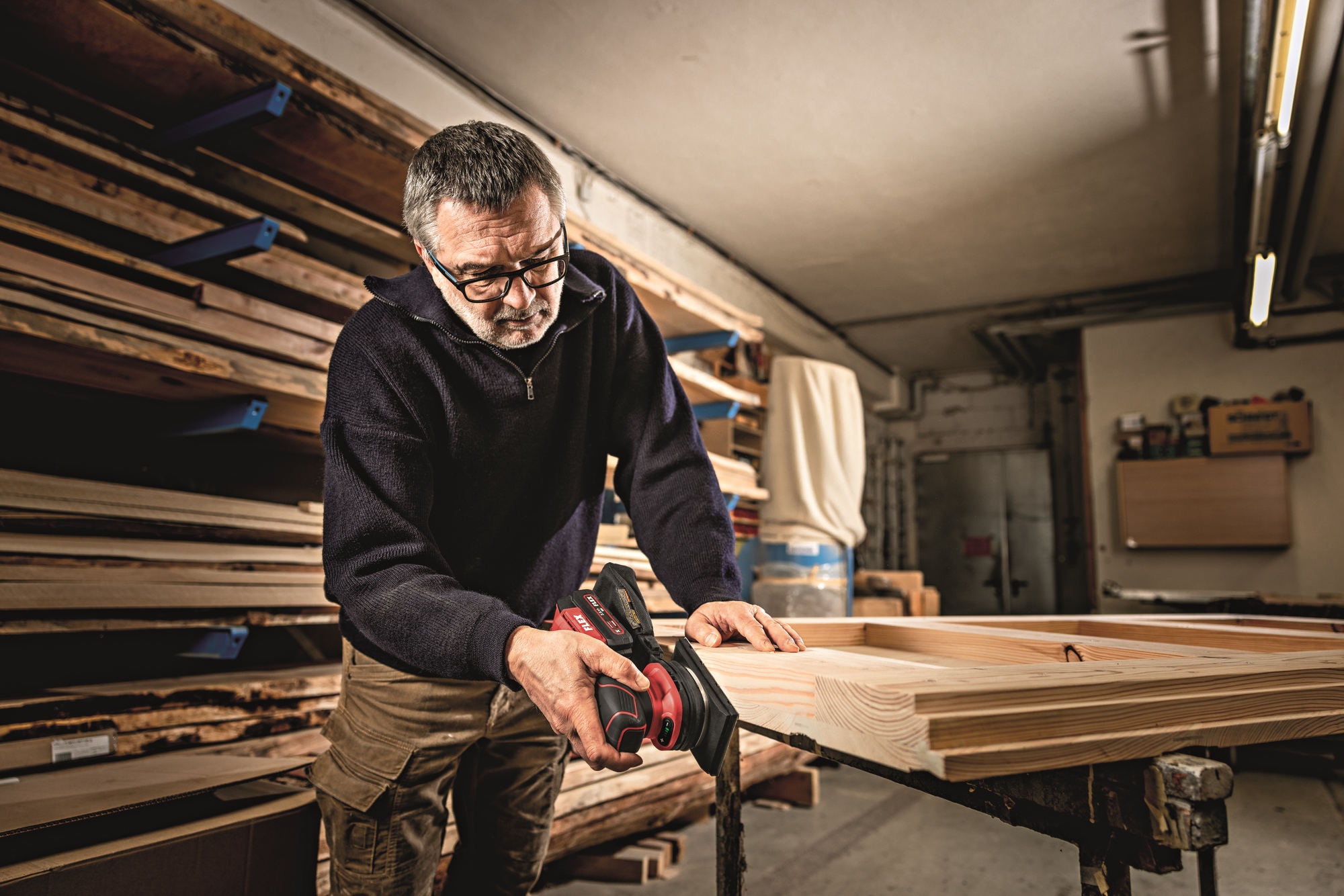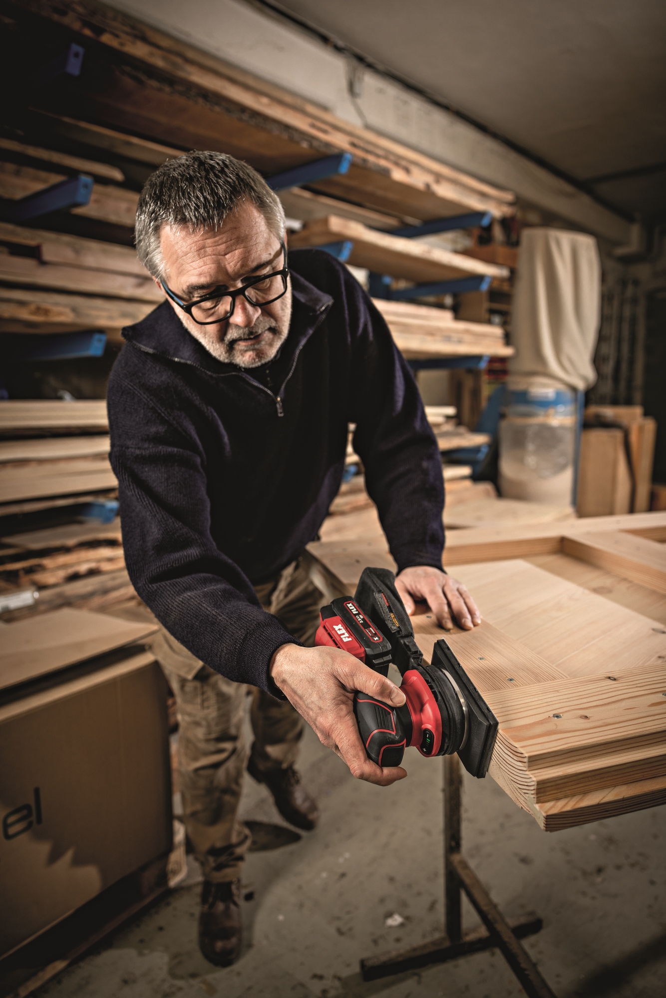 Ponceuse orbitale à une main légère, compacte, particulièrement ergonomique et à faibles vibrations grâce à un équilibrage spécial pour un travail sans fatigue ménageant les articulations