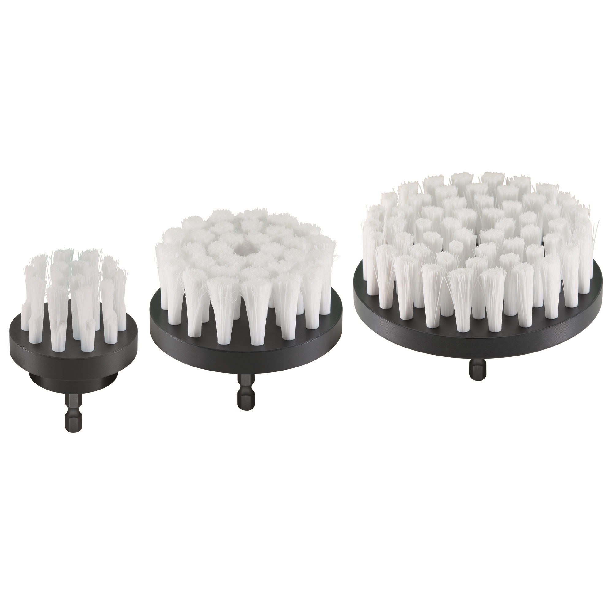 Tre pratiche spazzole (Ø 50, 75, 100 mm) di alta qualità per la pulizia di superfici sensibili in tessuto e plastica, Made in Germany. Massima protezione della superficie grazie a setole per la pulizia extra morbide, resistenti ad acidi ed alcali. Le spazzole sono realizzate in un materiale senza pieghe che mantiene la sua forma. Con supporto esagonale che impedisce alle spazzole di scivolare nel mandrino.