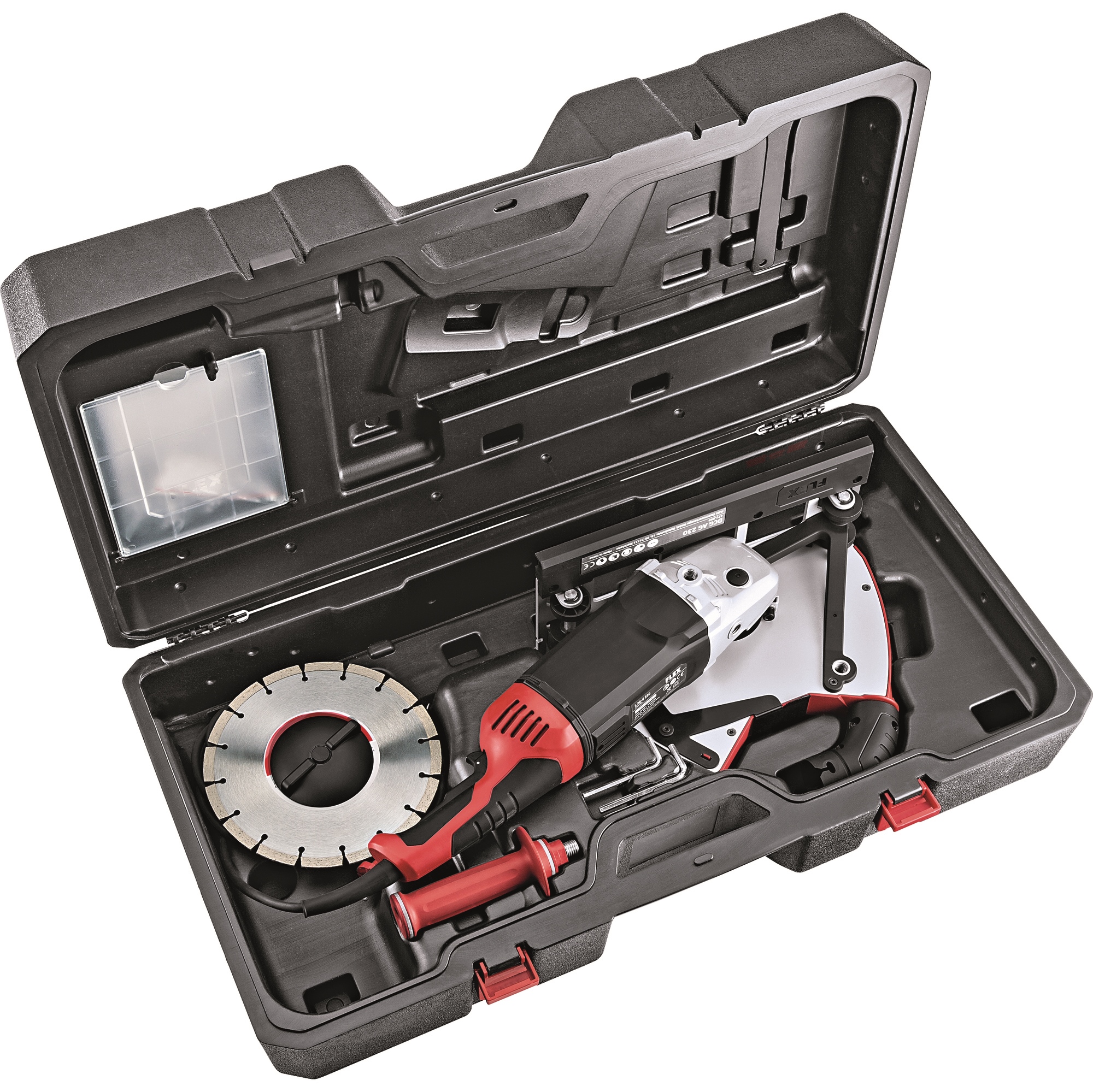 Valigetta con scomparto integrato nel coperchio per minuteria, conservazione di dischi per troncatura diamantati, impugnatura laterale e guida da 800 mm